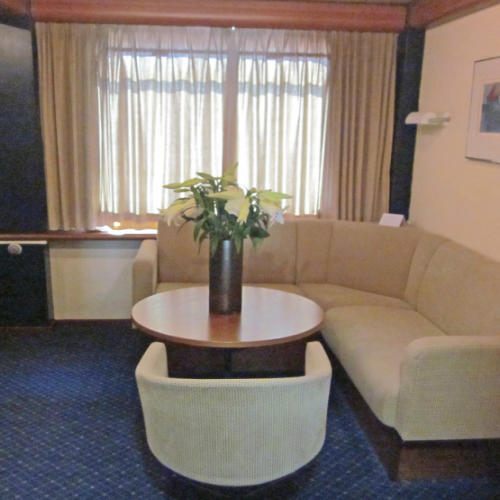 The comfortable cabins (12 square metres) and suites (24 square metres) have two lower beds and two adjoining beds respectively. All cabins are equipped with mini bar, bathroom with shower and WC, TV, Central Controlled ventilation, telephone and hairdryer. On the upper deck all cabins have large, tiltable Panoramic windows. On the main deck, the two smaller windows do not open.